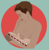 Barriga con barriga (body to body), quiere decir que el bebé debe estar bien pegadito a nuestro cuerpo. No necesariamente que coincidan de forma exacta las dos barrigas, sino más bien evitando exceso de ropas que interfieran, y otras separaciones. Durante la toma el contacto directo es muy importante y si es posible un contacto piel con piel, estando encima de la mamá.